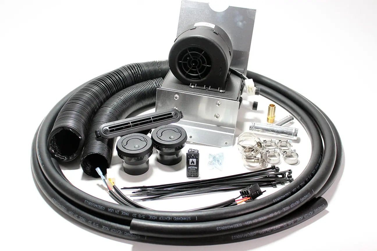 Includes all necessary components: heater hose, hose splicers, hose clamps, mounting brackets, defrost and floor louvers, ductwork & wiring.