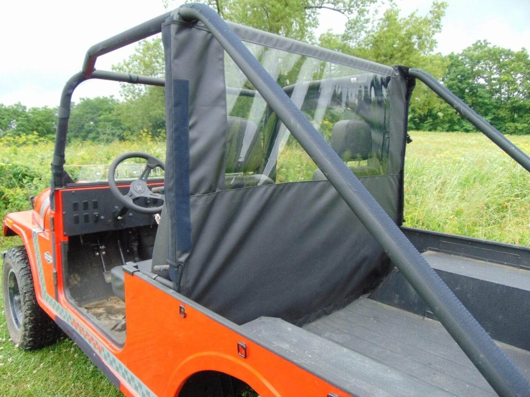 Got a hard top and windshield, but you need to stop the blow back from the bed into the cab.  The Mahindra Roxor modular soft back panel will do the trick.  Proudly made in the USA, the 3 Star Industries’ soft back panel is a great value.