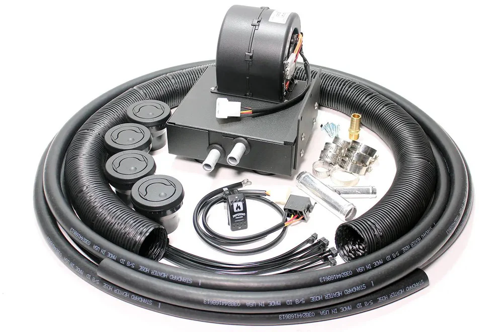 - Includes all necessary components: heater hose, hose splicers, hose clamps, mounting brackets, defrost and floor louvers, ductwork & wiring.