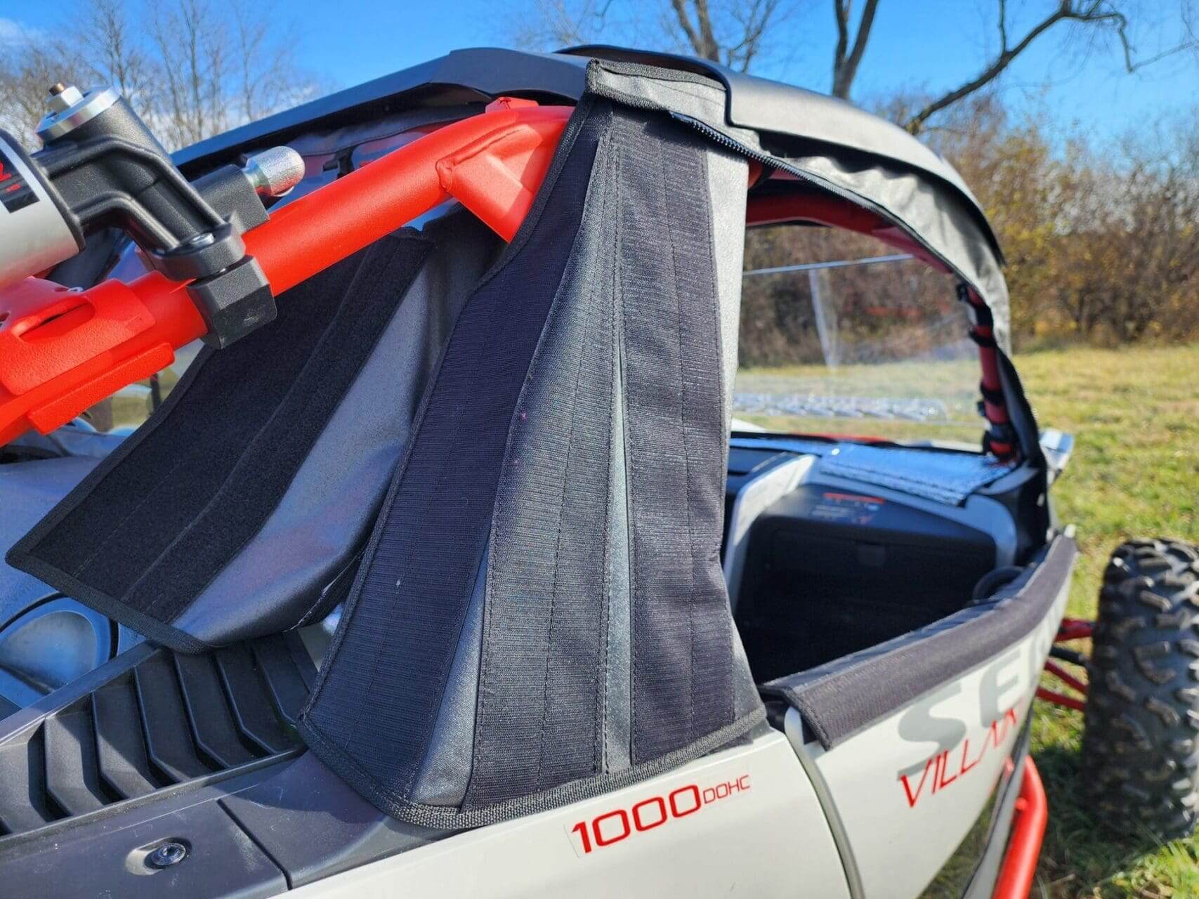 The door/rear panel combo comes with a “saddle” to install over the factory door and a roll bar pad to help secure the doors and rear panel to the Villain.